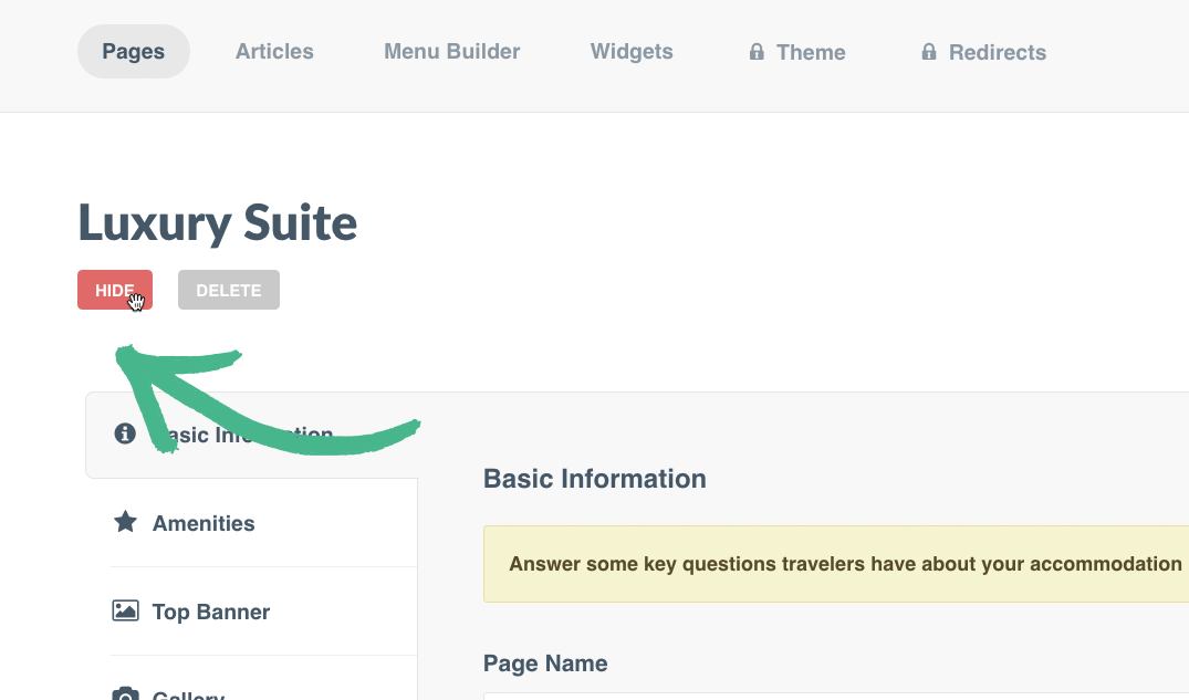 Note: New pages, blog articles, and special offers you create will be Hidden by default until you are ready to take them live. Your Homepage will always be Live.