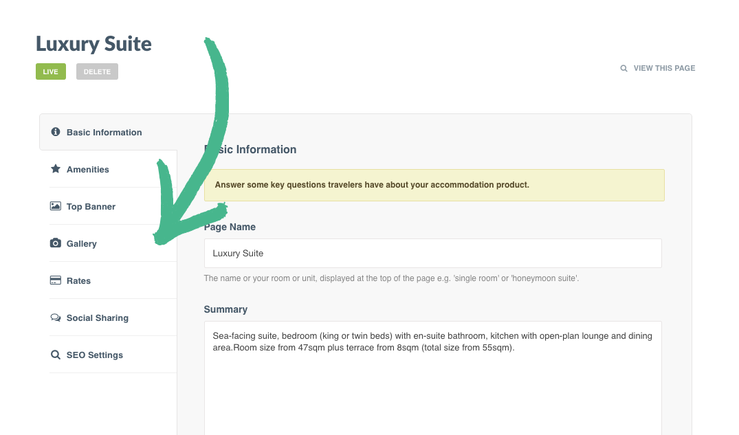 In the screenshot below, an Accommodation Page, called "Luxury Suite" is being edited. The options that you are able to edit on this page include the basic information (name and description of the room), the amenities available in the room, the top banner or slider for the page, an image gallery for the room, and more.