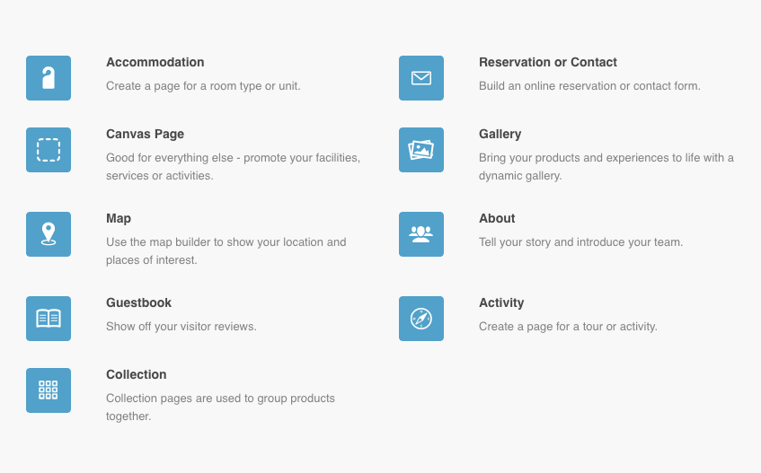 Springnest uses different page types, each with a specific function and purpose. Your website can have more than one of each (e.g., an Accommodation page for each of your rooms). Each page type has a unique selection of features you can use and areas you can edit.