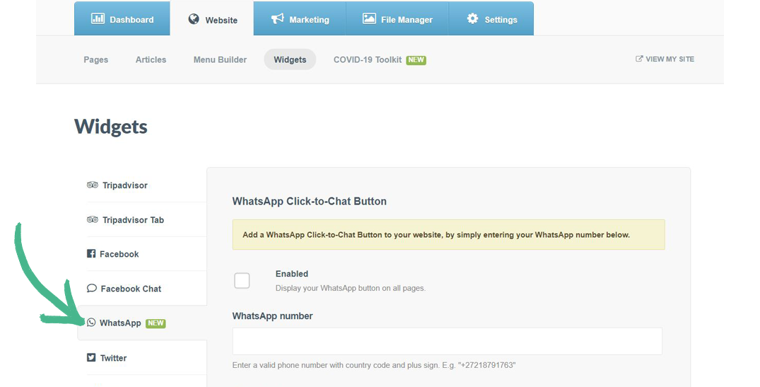 Step 1: In the Website tab > click the Widgets section > select WhatsApp from the left-hand menu
