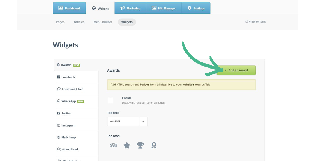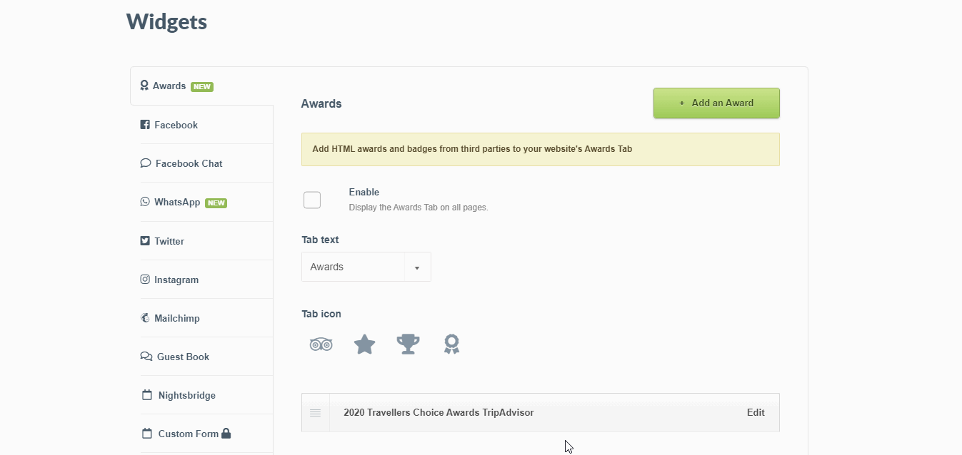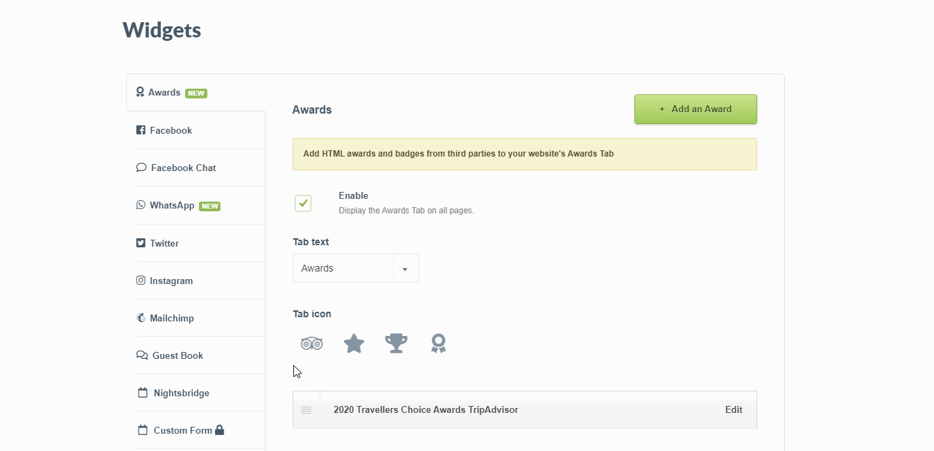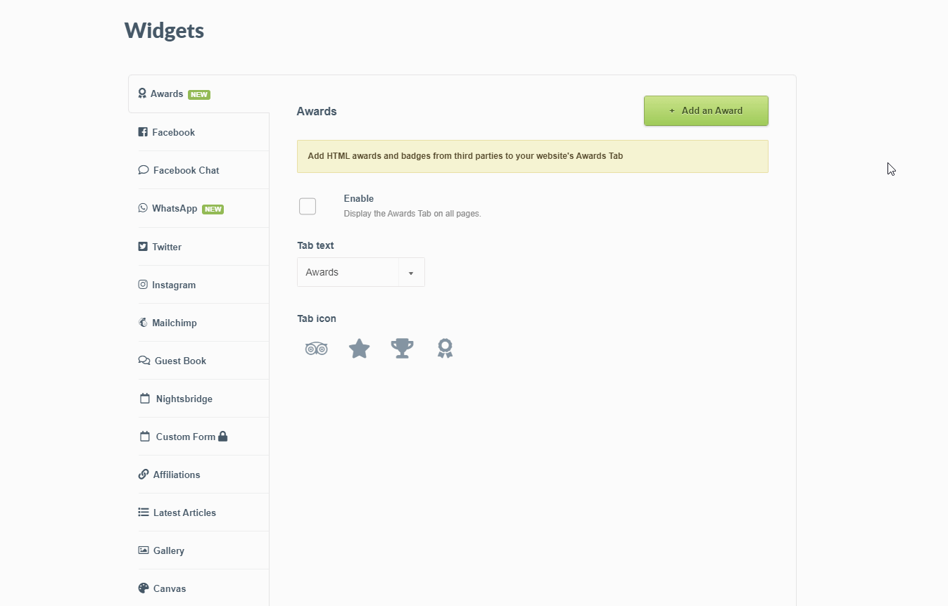 The Awards widget allows you to add HTML awards and badges from third parties to your website's floating Awards Tab on the right-hand side of your website.