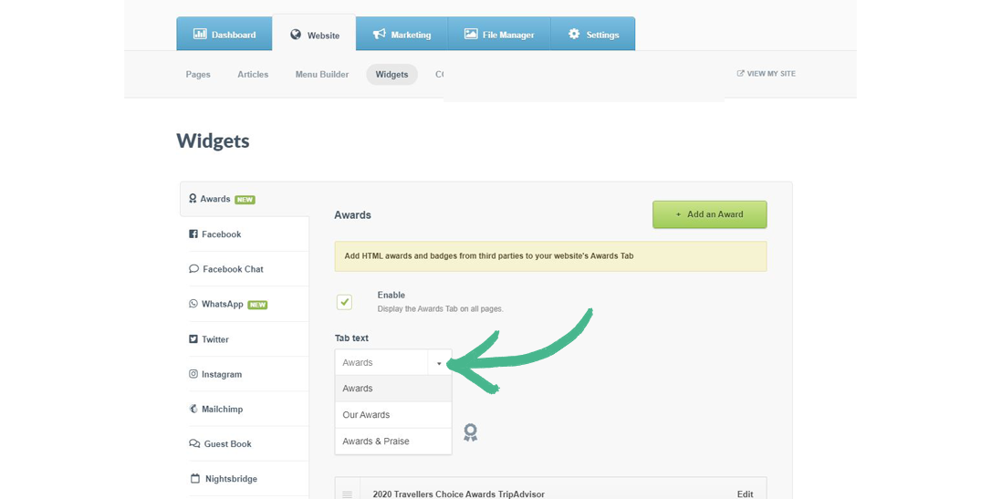 Step 1: Select the Website tab > Click Widgets > Select Awards from the left-hand menu