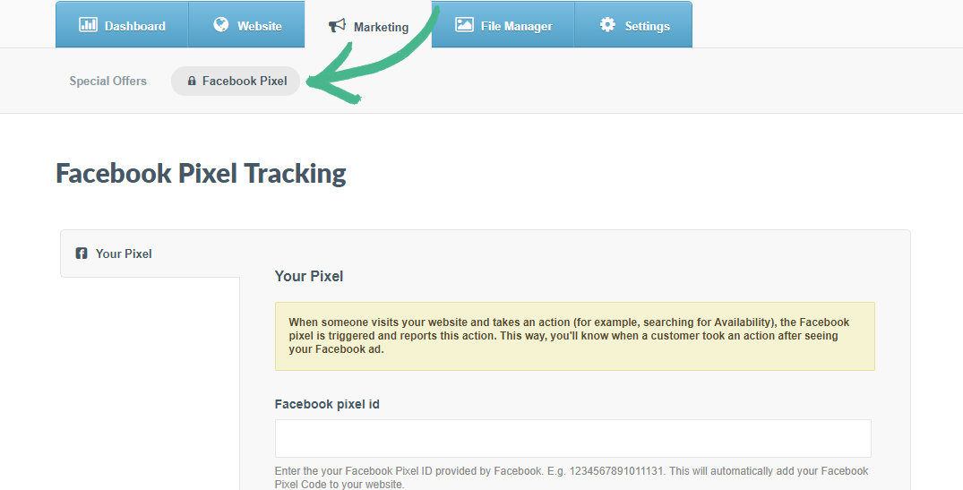 Step 1: In a new window or tab click the Marketing tab > click Facebook Pixel