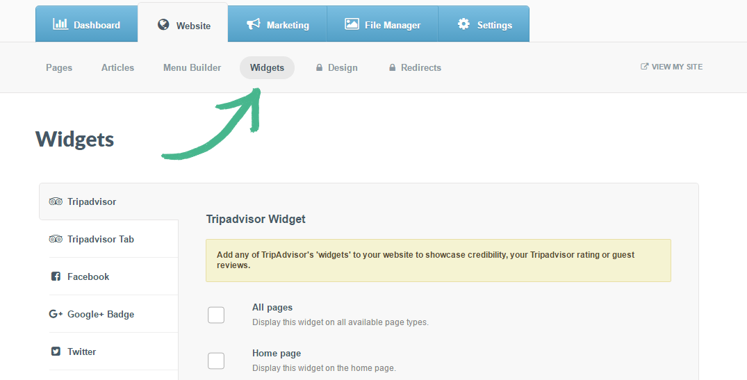 Step 1: Select the Website tab > Click the Widgets button > The TripAdvisor widget will automatically be selected