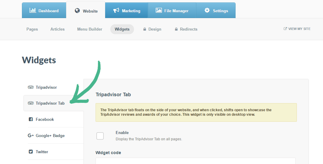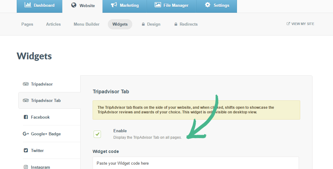 Step 2: Visit TripAdvisors Widget Centre > Copy and paste the relevant Widget code into the Widget code field in Springnest > Check the Enable box > Click Save