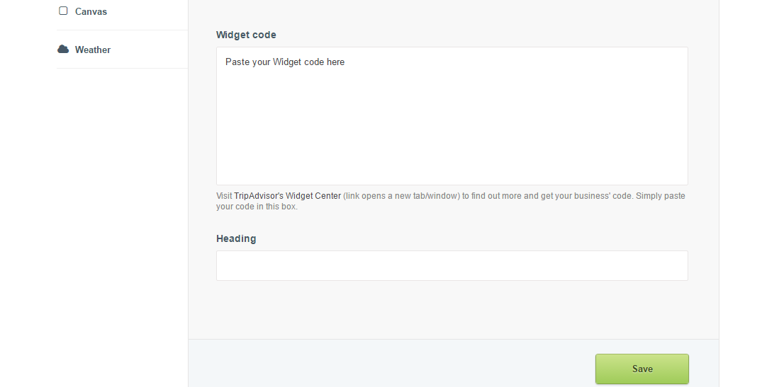 Step 2: Visit TripAdvisors Widget Centre > Copy and paste the relevant Widget code into the Widget code field in Springnest > Click Save
