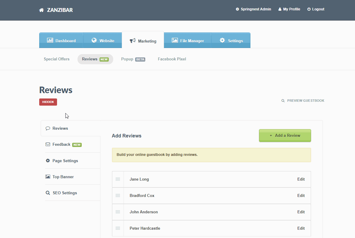 You can choose to set your Reviews Page as Hidden of Live. When Live, this page will appear in the Menu Builder. We recommend adding at least one Review before setting this page as Live.