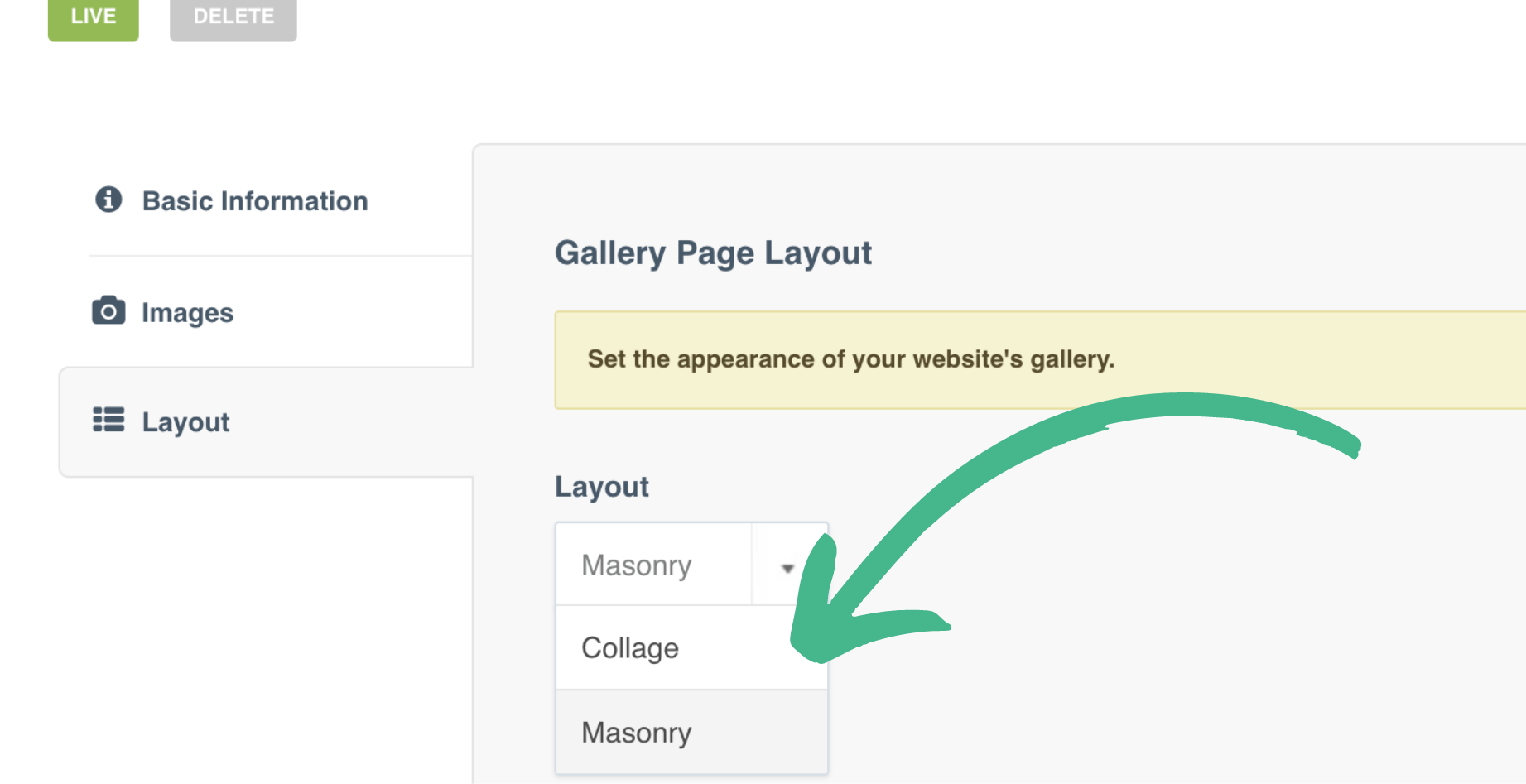 Step 1: Edit your Gallery Page, and select Layout from the lefthand menu