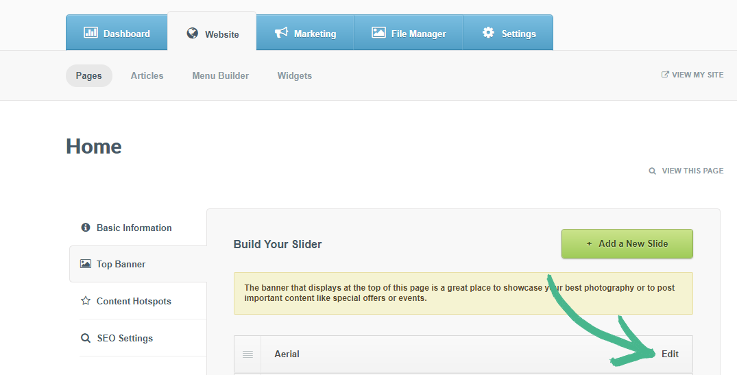 Step 2: Select Top Banner in the left-hand menu > Click Edit next to the slide you would like to add Text or a Button to