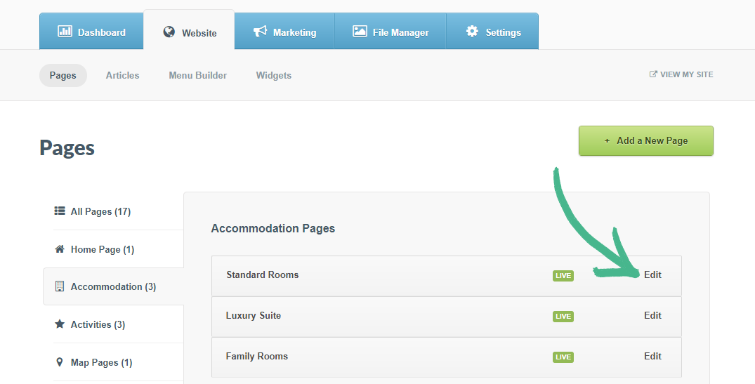Step 1: Select the Website tab > Click Pages > Click Edit, next to an Accommodation page of your choice