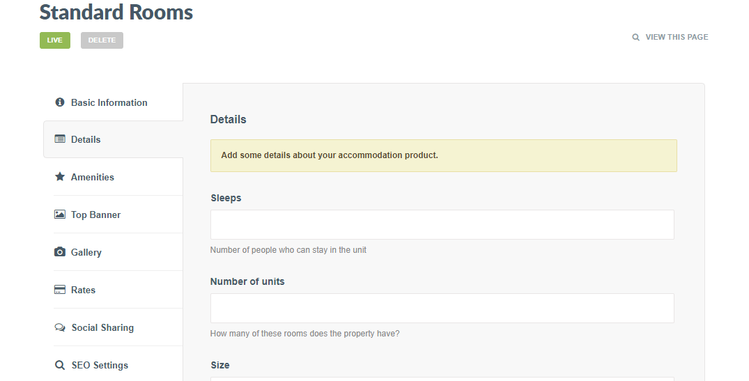 Using the Details section on Accommodation pages will give any website visitor an idea of the configuration of a specific room type. Details that can be added are: the number of people that can be accommodated (eg. sleeps 4), the number of units on offer and the size of the unit.