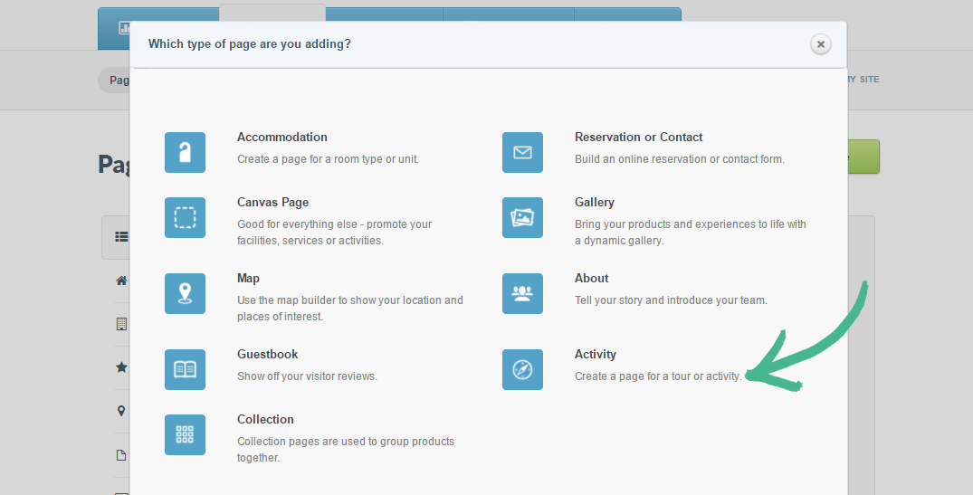 Step 1: Select the Website tab > Click the +Add a new page button > Select the Activity page icon