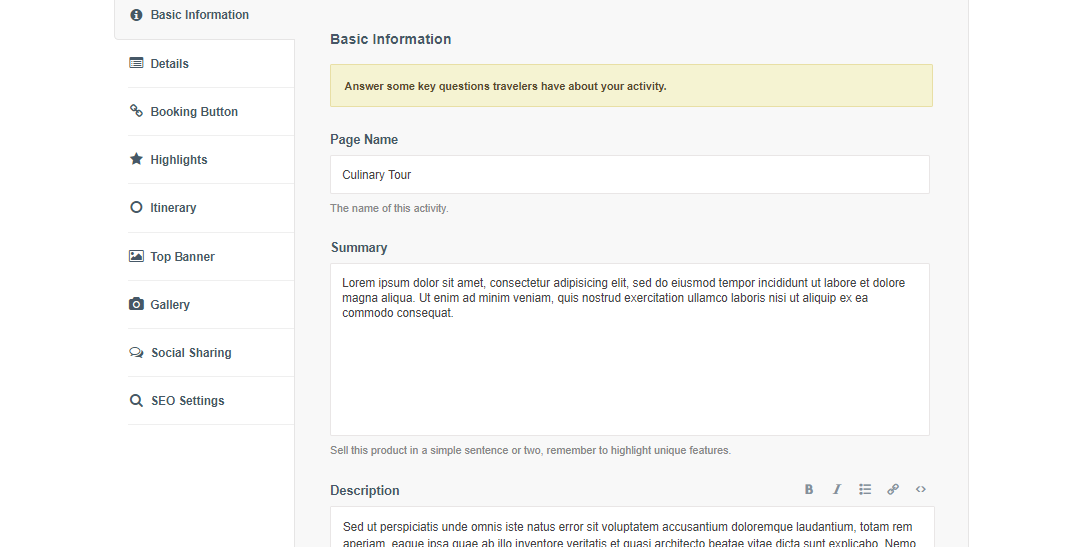 All the information added to the fields in Details are visible in the sidebar of the page, keep the information about the tour or activity clear and concise.