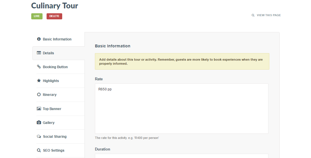 Step 3: Click Details in the left-hand menu > Add a Rate for the tour or activity (incl per person or per group) > Specify how long the tour or activity will be in the Duration field