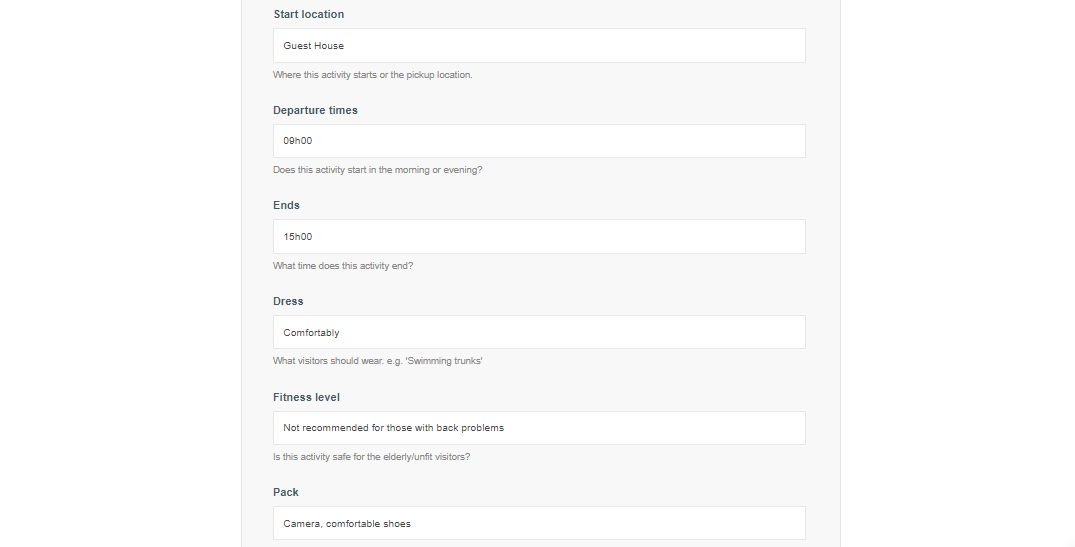 Step 3: Start Location, Departure times, Ends, Dress, Fitness Level and Pack > These fields are not compulsory, you can complete the fields that are relevant to your tour or activity