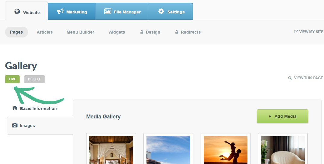Step 3: Below the Gallery title, there's a green button entitled Live > This indicates that the page is visible on your website