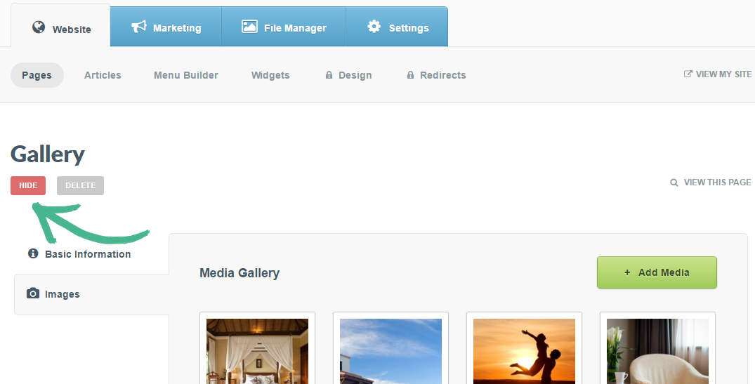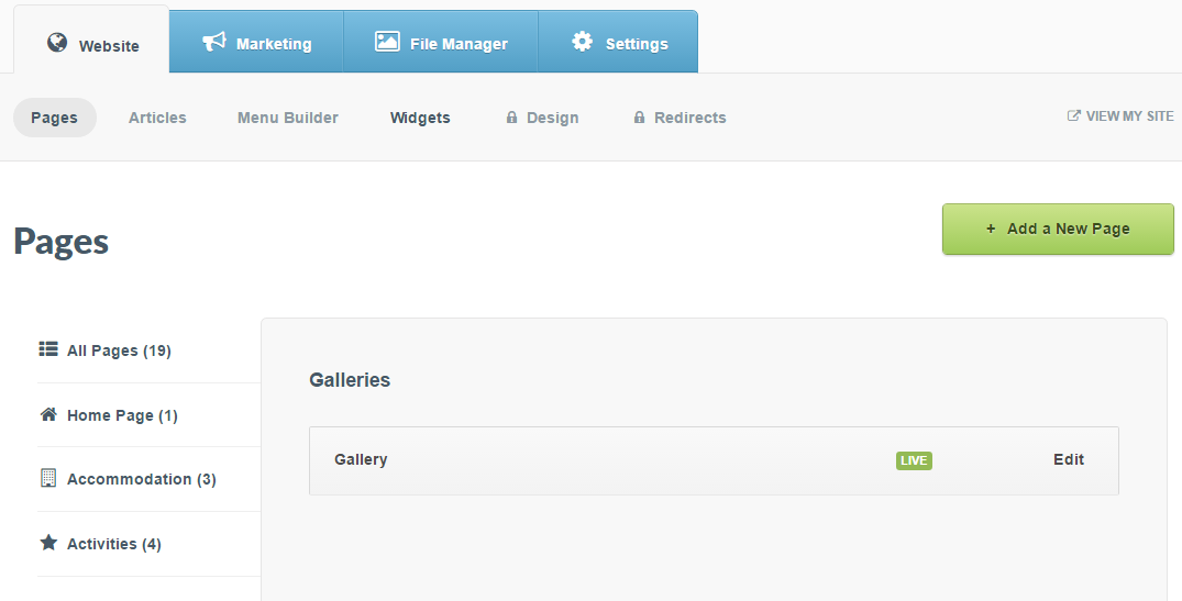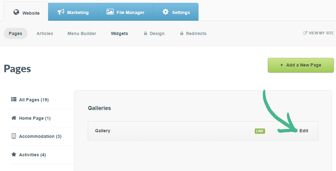 Step 1: Select the Website tab > Click Pages > Click Gallery in the left-hand menu