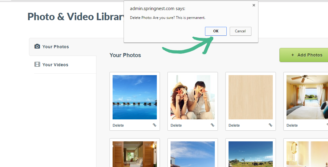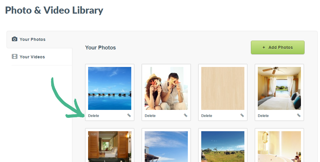 Step 2: In the Your Photos/Your videos section in the left-hand menu > Find the photo or video thumbnail you would like to remove > Click Delete in the bottom left-hand corner of the file's thumbnail