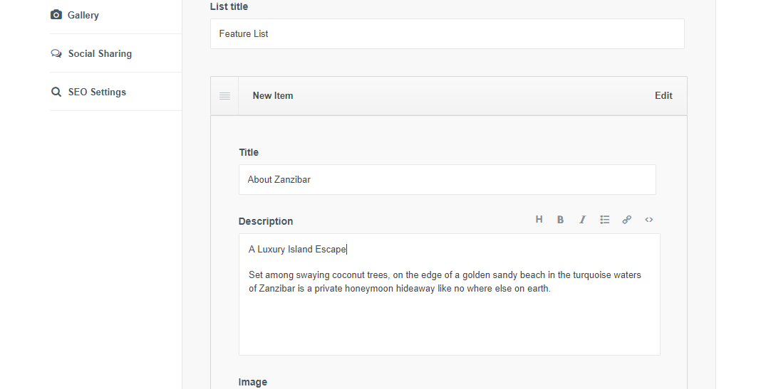 List items offer an easy way to add information into various sections. Each list item has a heading, description, and optional image or video with a button link.