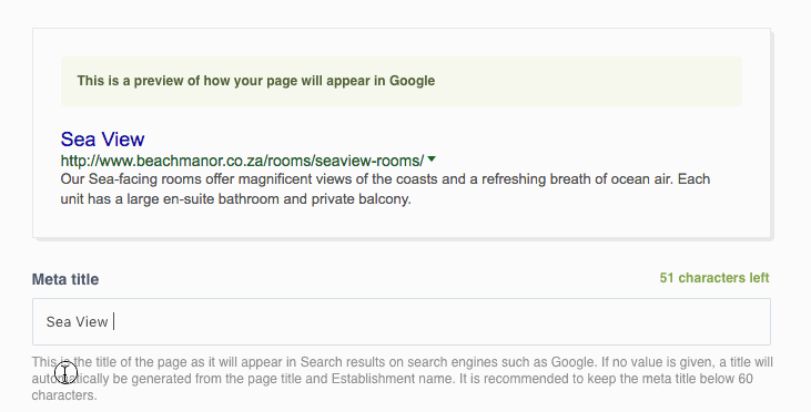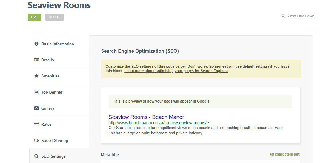Note: The Meta Title is the name of the page as it appears as the blue heading text, in search results on search engines such as Google. If you leave this blank, Springnest will automatically generate a title for you, using the page's content and the name of your establishment.