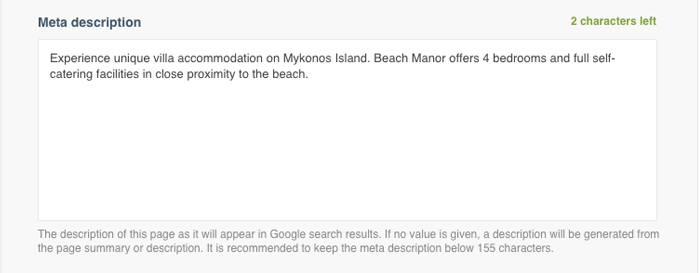 Note: The Meta description will appear in Google search results, as the gray text, below the Meta Title. It should briefly give a potential website visitor an indication of what they will fond on the page, as well as an incentive to click. If no value is given, a description will be generated from the page summary or description.
