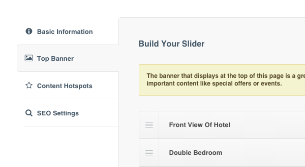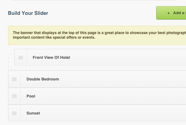 Image Sliders are great for showcasing your best images or videos, and for highlighting important information. These appear at the top of pages, and are available on all page types, except Gallery pages.
