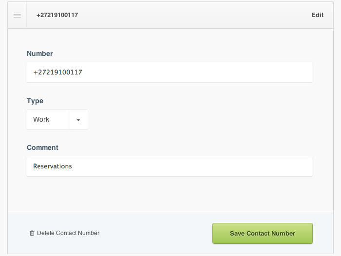 Note: Add more details about this contact number in the Comment field. This could be the name of the contact person, the availability of the contact person or a description like Reservations.