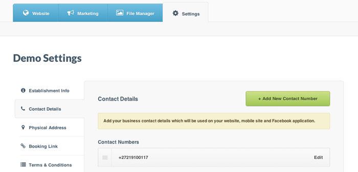 Displaying clear contact details on your marketing collateral is very important. You are able to add multiple contact numbers to your business's profile, which will show up on your website, mobile website, and Facebook Social Brochure.