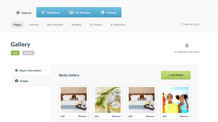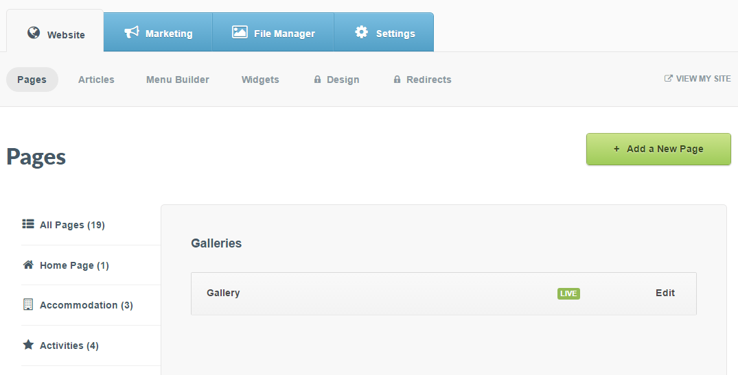 Step 1: Select the Website tab > Click Pages > Select Galleries from the left-hand menu