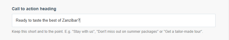 Note: This information will appear above the button, and should draw the reader's attention. Keep this short and to the point. Eg. "Stay with us", "Don't miss out on summer packages" or "Get a tailor-made tour".