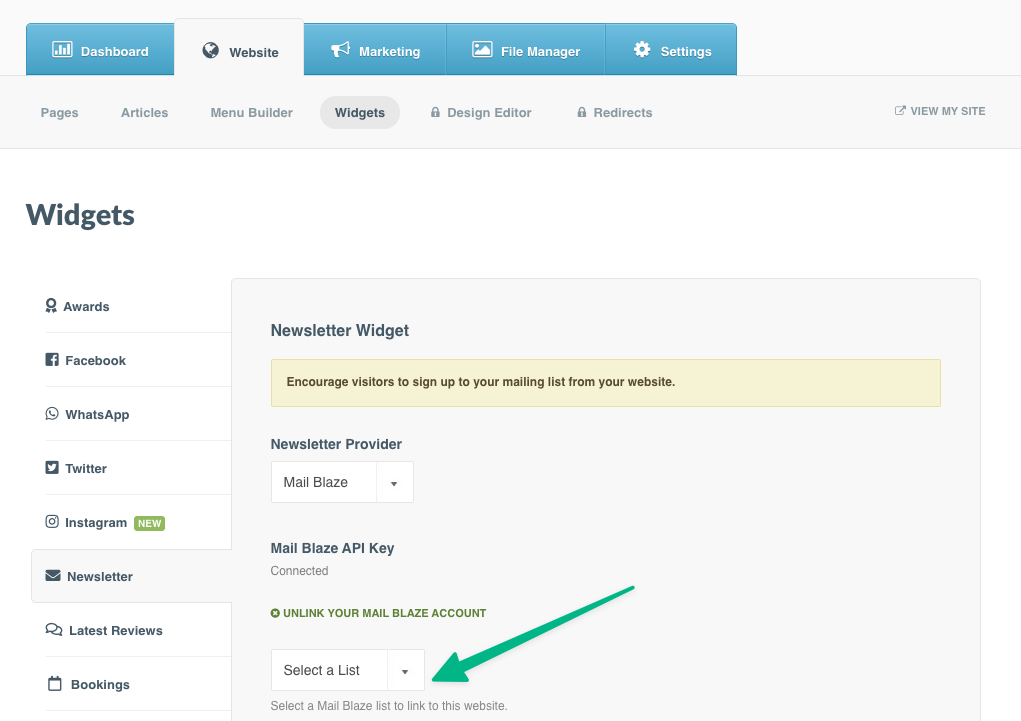 Note: The newsletter signup widget will now be active on your website. Visitors who subscribe will be automatically added to your selected Mail Blaze list.>