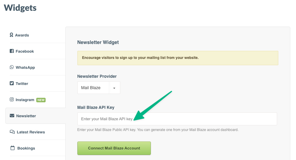 Step 4: Select Mail Blaze from the Newsletter Provider dropdown > Paste your Public Key into the Mail Blaze API Key field