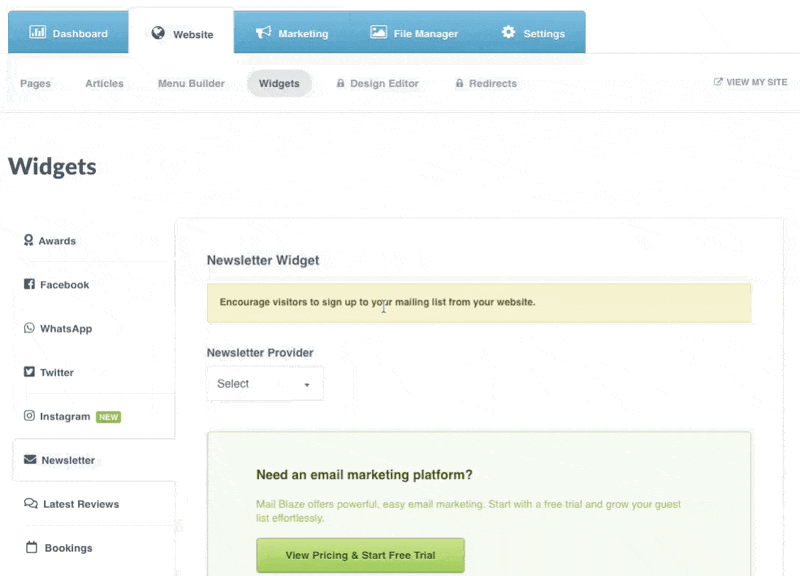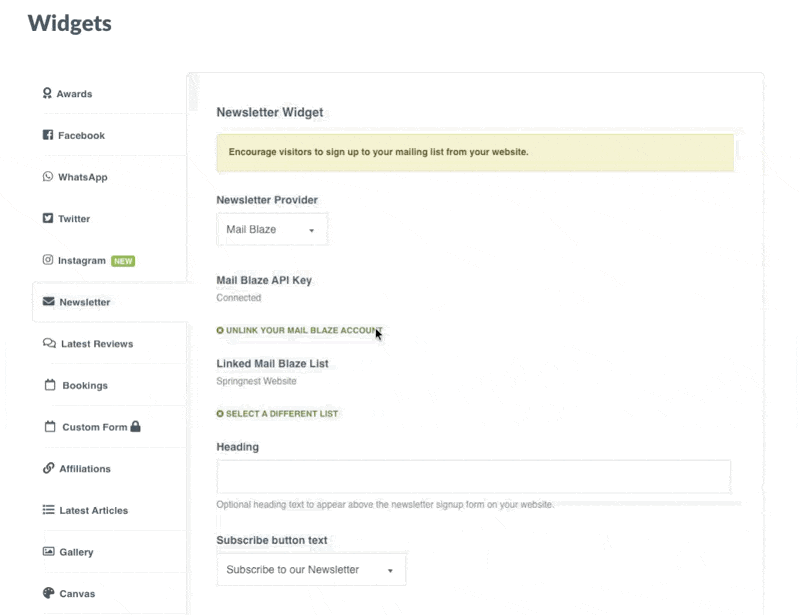 Step 3: In your Springnest Admin, navigate to the Website tab and click Widgets > Click Newsletter from the left-hand menu